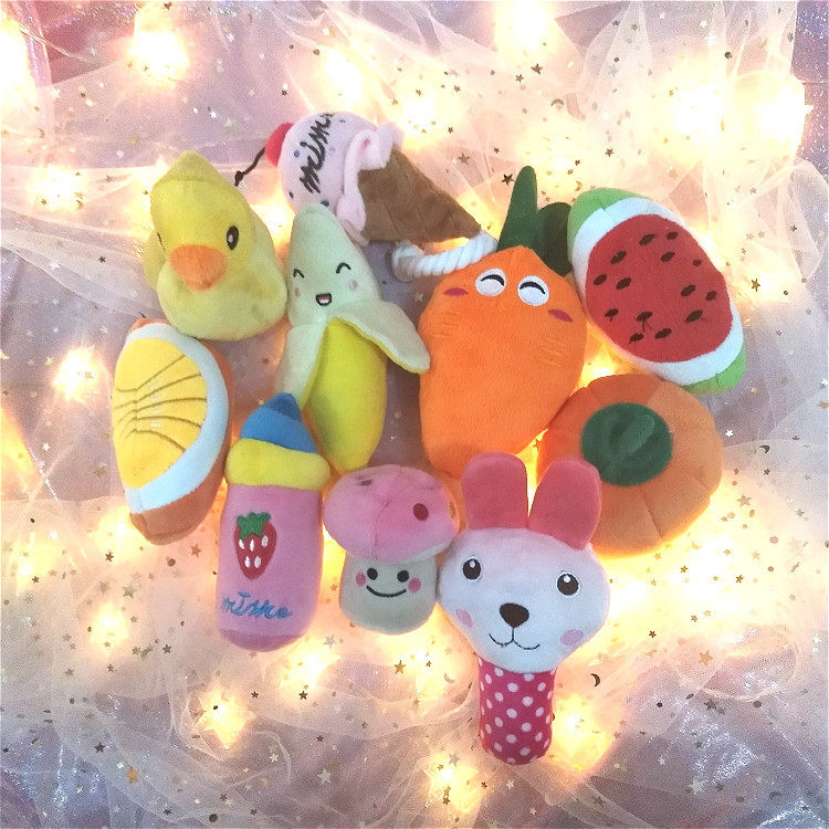 Rectangular watermelon toy navel orange sounding toy pink lollipop pumpkin sounding toy purple eggplant sounding toy donut pink pink bottle sounding toy blue bottle sounding toy carrot sounding toy