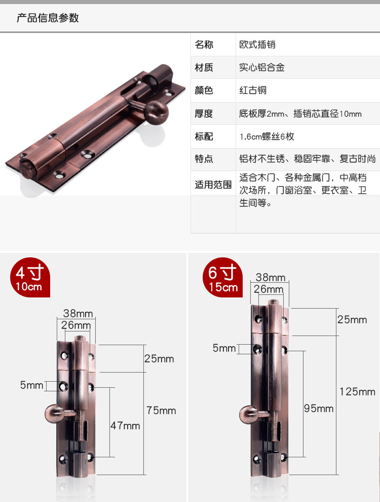 Thickened antique latch Aluminum alloy wooden door copper bolt Chinese door lock buckle latch European retro 4 inch 6 inch surface mounted