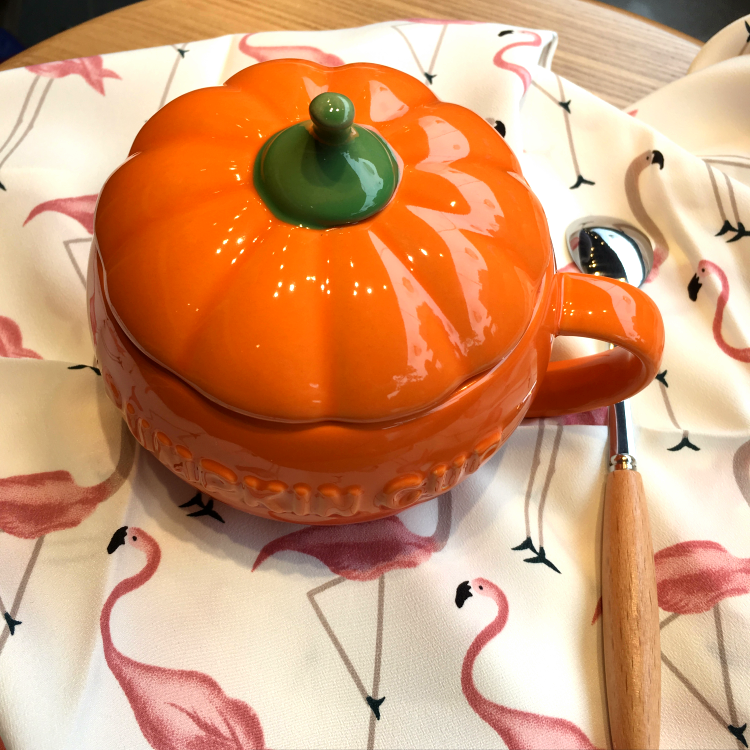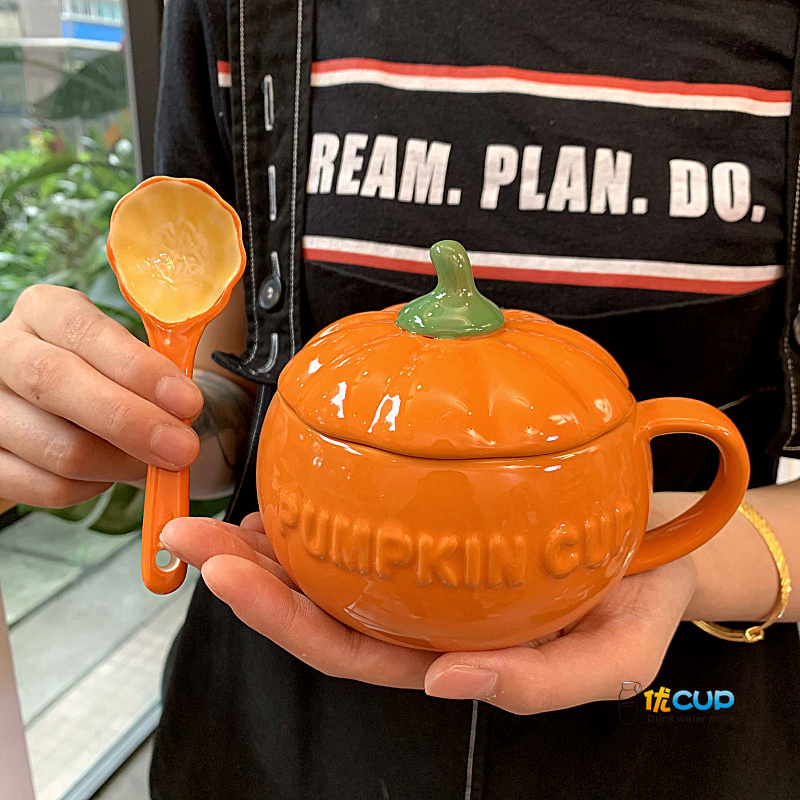 Cute Pumpkin Ceramic Cup Pumpkin Ceramic Spoon Cute Pumpkin Ceramic Cup Single Cup Pumpkin Ceramic Cup Add Wood Handle Spoon Pumpkin With Lid Small Bowl Nordic Golden Ty White Body Halloween Ghost Pumpkin Cup Outside single delivered wood handle steel