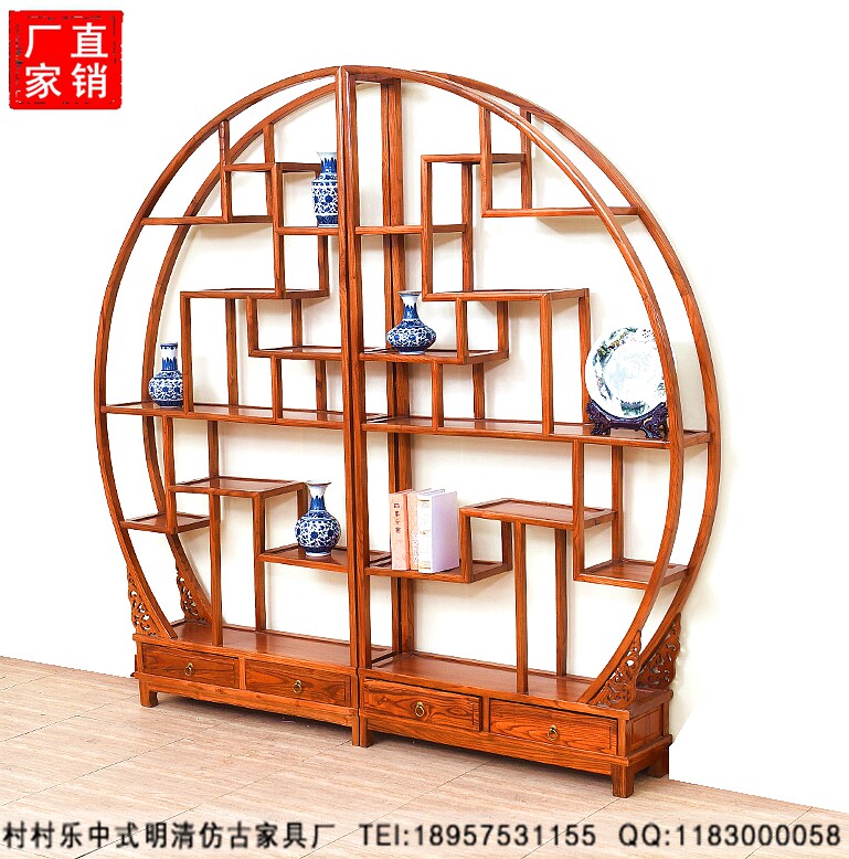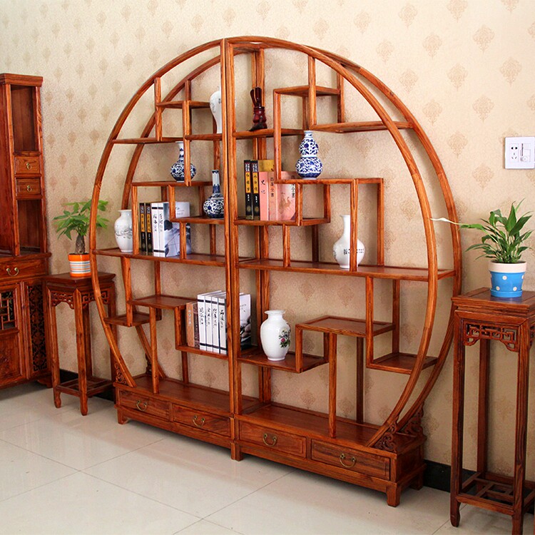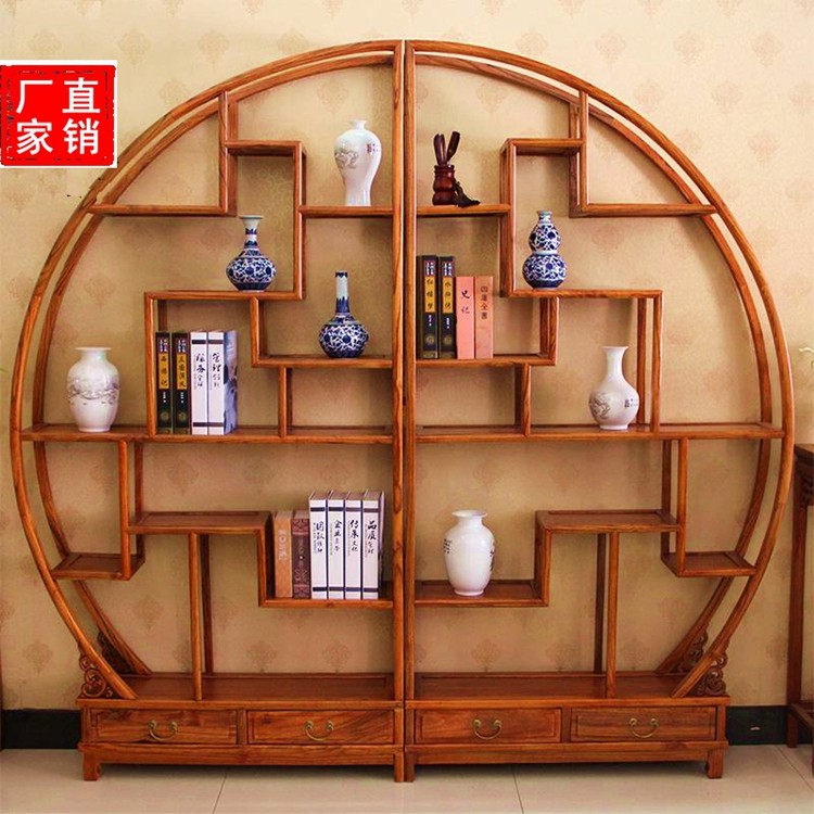 Red pear chicken wings Rosewood Elm Chinese bookshelf Solid wood display cabinet Tea rack Double semicircular size round Bogu rack