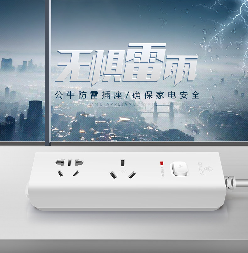 Bull socket wiring board 2 plug high power 4000W air conditioning lightning protection plug extension line 16A 1 8 meters