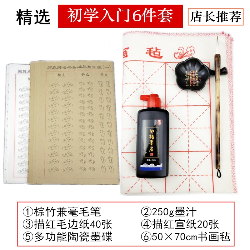 Pen ink paper inkstone felt beginner 6 pieces (Shop length Recommended yellow wool side paper with 40 sheets of bag white Xuan paper 20 Zhang bag
