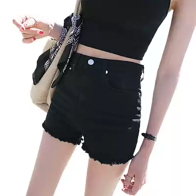 Black raw edge high waist denim shorts women's thin spring new Korean elastic tight-fitting thin large size hot pants trend
