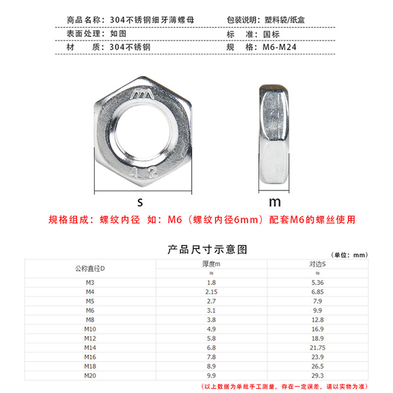 304 stainless steel hexagon thin nut thin nut flat thin nut M3M4M5M6M8M10M12M14M16-20