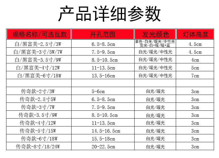 2 5 inches 3w White Fumei-Default white light 3 inches 5w White Fumei-Default white light 3 inches 7w White Fumei-Default white light 3 5 inches 9w White Fumei-Default white light 4-inch 12w White Fumei