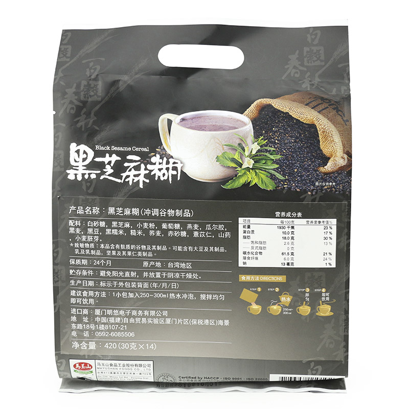White sugar, black sesame, wheat flour, glucose, oats, guar gum, rye, black beans, black glutinous rice, brown rice, buckwheat, red sugar, barley, yam, wheat germ