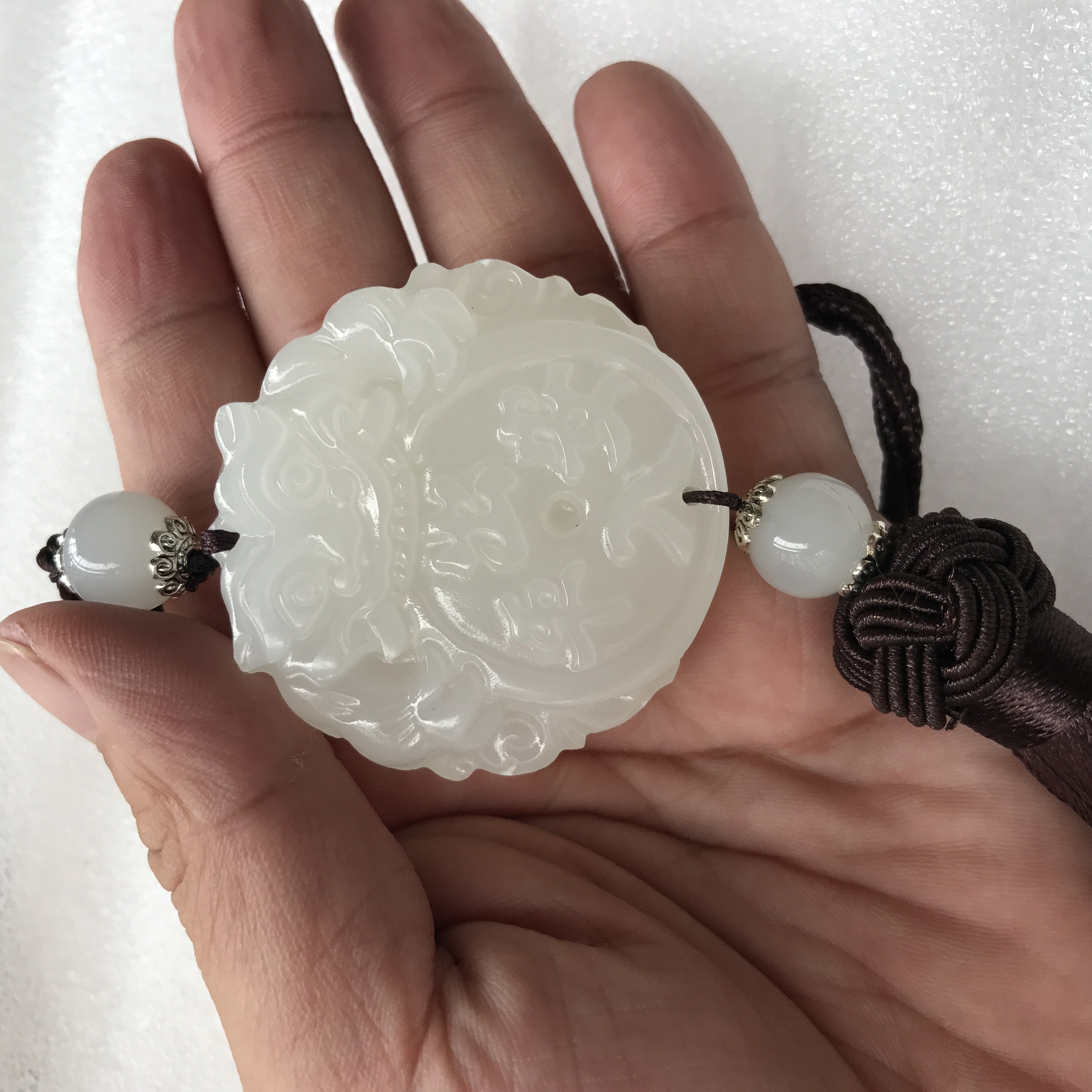 Extraordinary artisan high-end car interior white jade mirror mounted decoration car handmade fashion round pendant