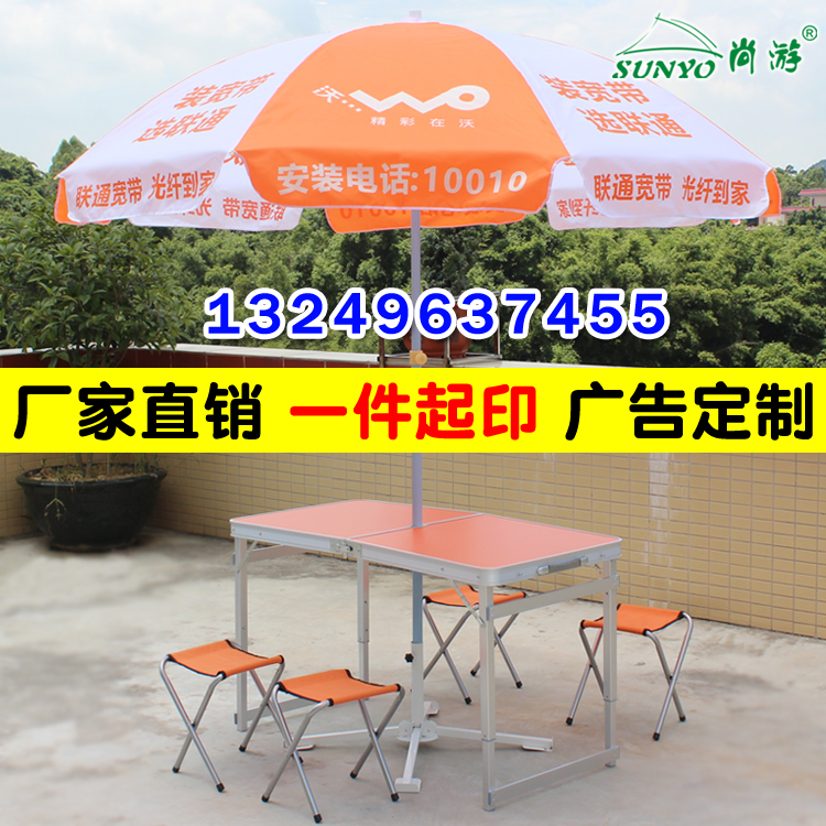 China Unicom logo advertising umbrella parasol custom orange and white outdoor publicity sun umbrella folding table and chairs