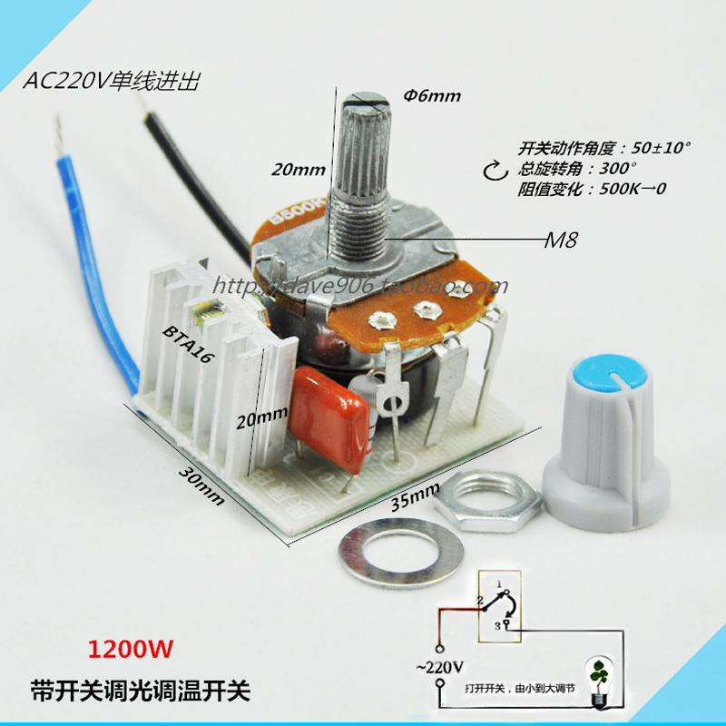 1200W AC stepless regulator switch Dimmer switch Thermostat switch Step-down temperature dimming speed control board