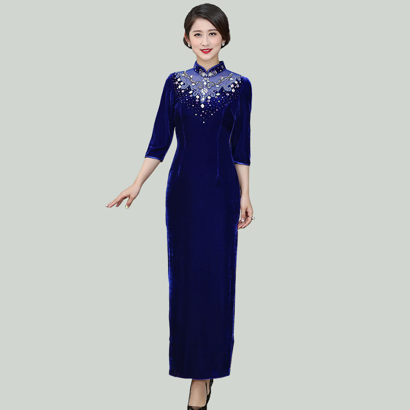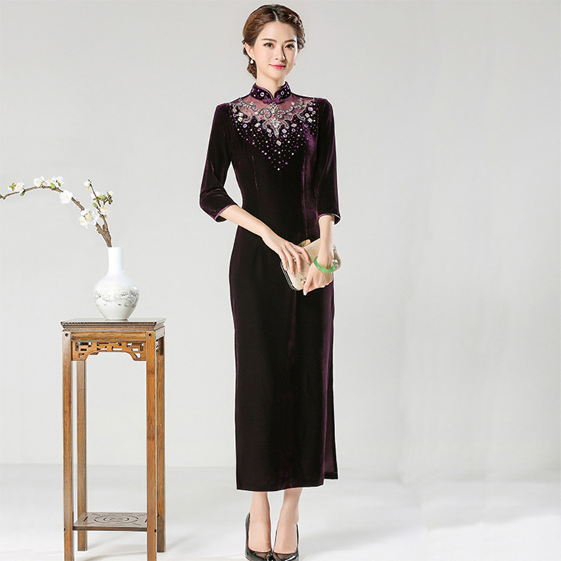 Golden Velvet Qipao Female Midyear Wedding Mom Long Version Temperament Elegant Walking Show Improvement Retro Fit 805
