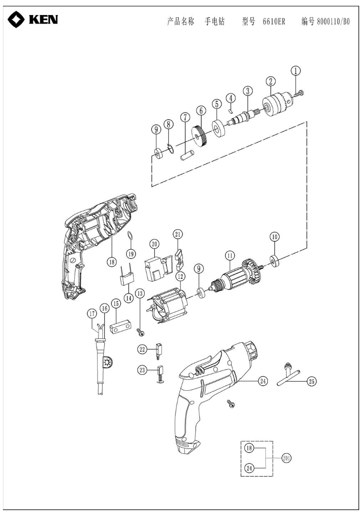 6610ER Drill chuck 6610ER Output shaft 6002-2RS Bearing 6610ER Large gear 608-2RS Bearing 6610ER Rotor 6610ER