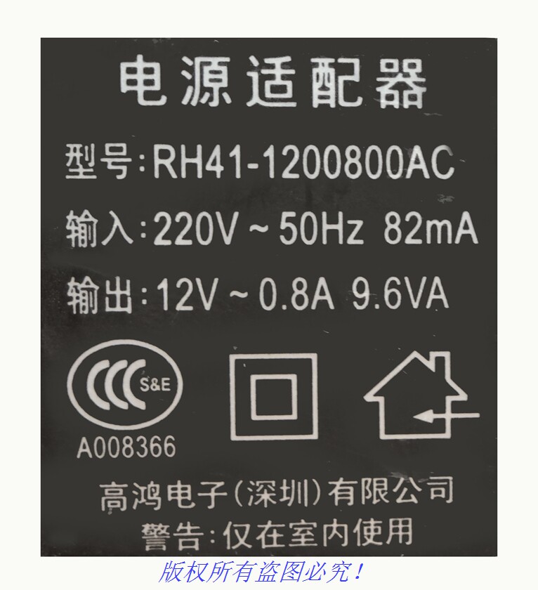 Original Gao Hong Electronics 12V~0.8A 9.6VA Power Adapter Model: RH41-1200800AC