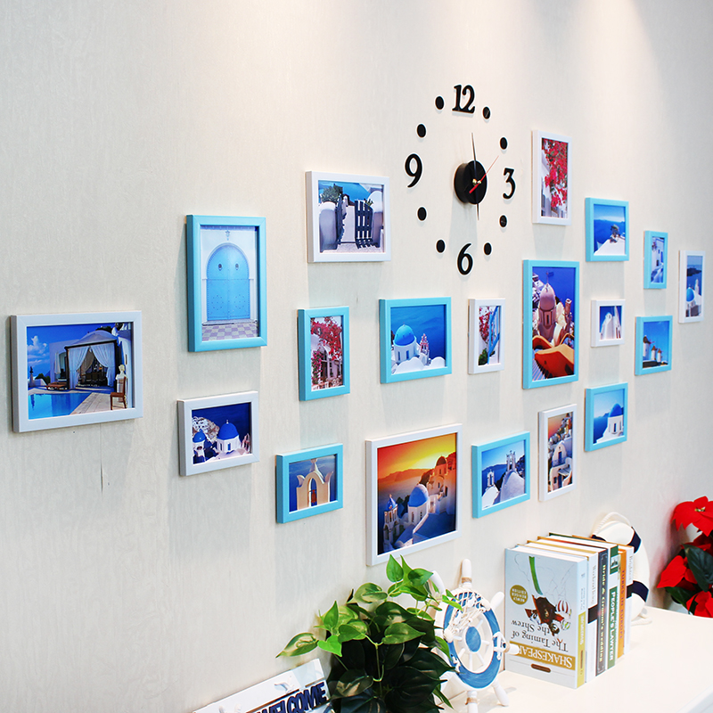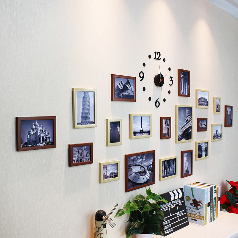 Retro photo wall 19 frame paired with acrylic clock hanging clock section photo wall Living room background wall Mediterranean