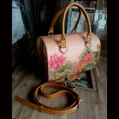Handmade leather men's bag women's bag custom leather carving painted lotus Boston women's bag satchel
