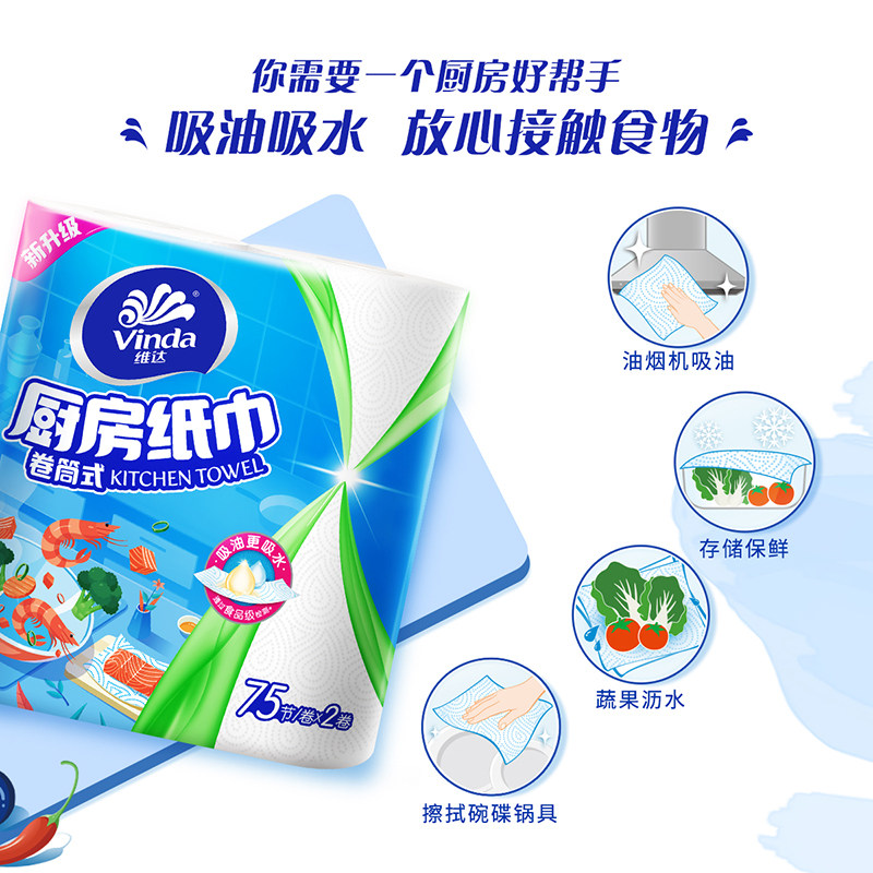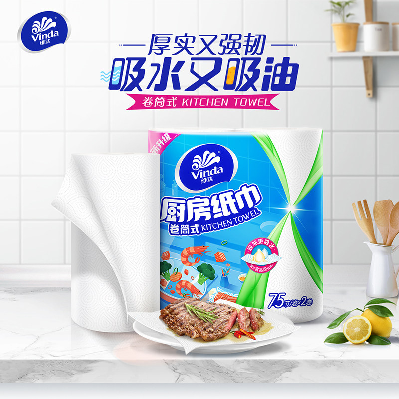 Vinda kitchen roll paper 2 layers 75 sections 8 roll kitchen oil-proof sticker toilet paper towel home affordable whole box