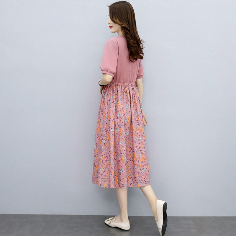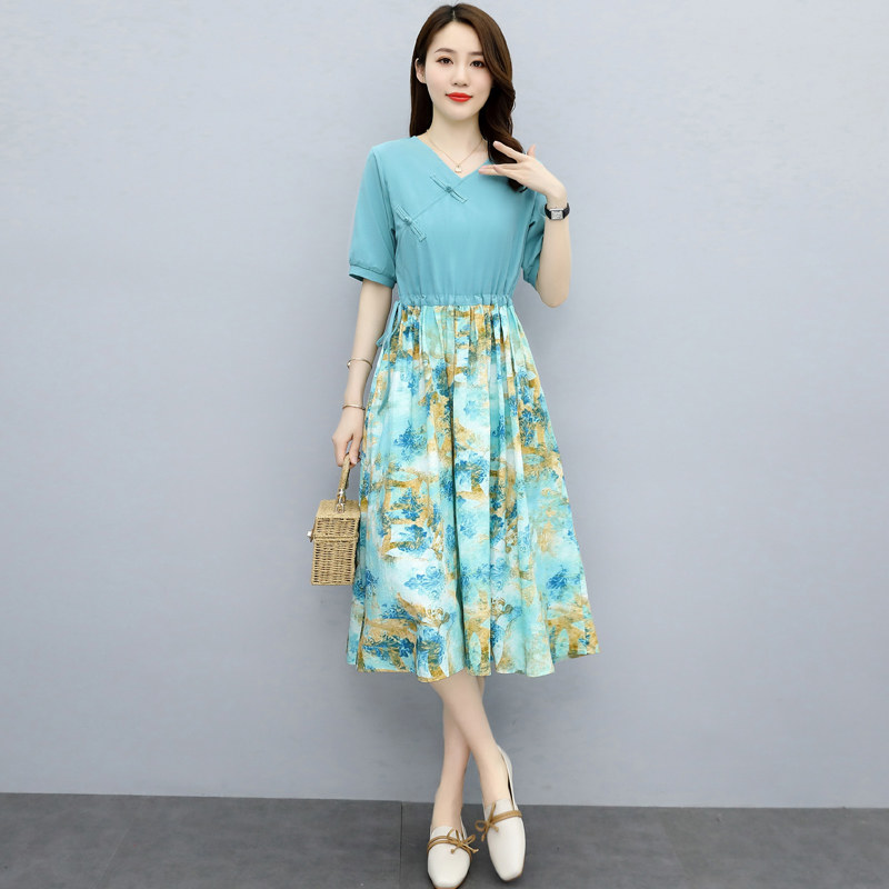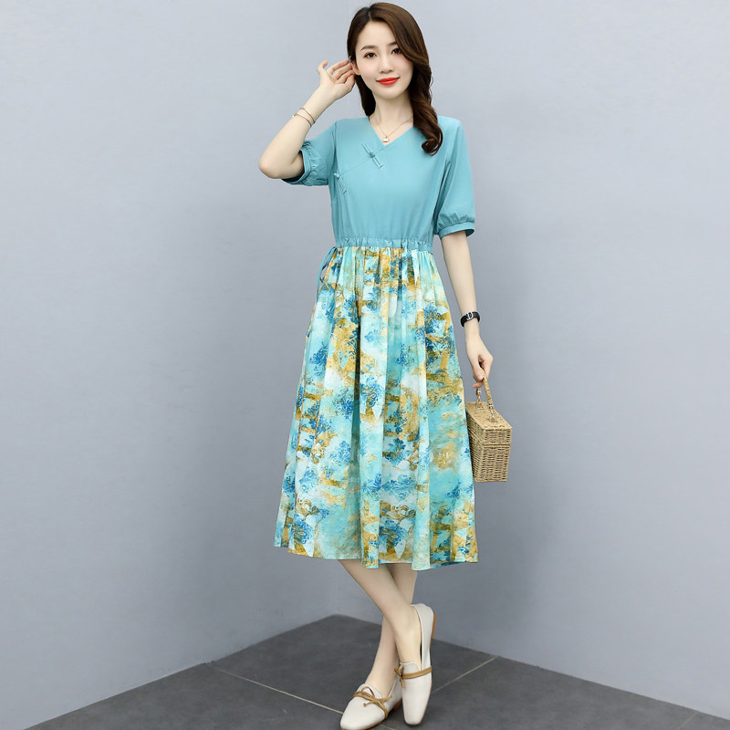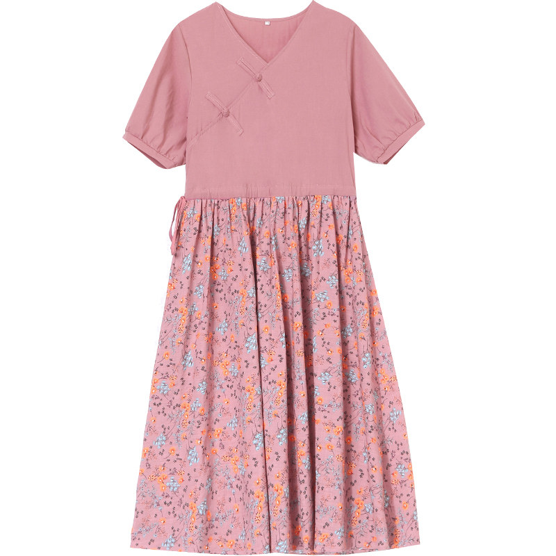 Chopped Cotton Linen Dress Medium Long Version 2022 Summer New Casual V Collar Art Ethnic Wind Splicing Mom Dresses