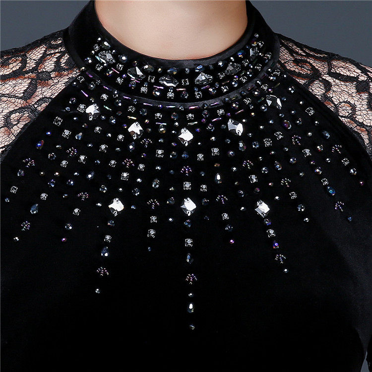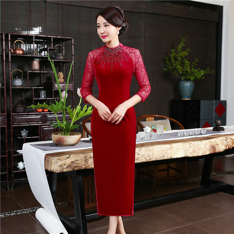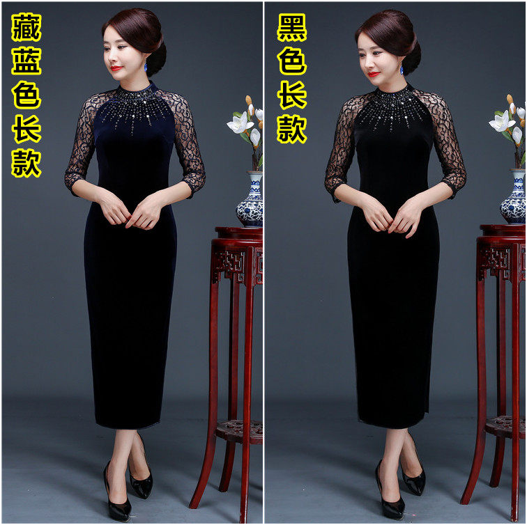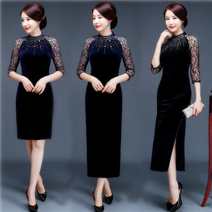 Fashion Improved Gold Velvet Gown Qipao Dress With Long Version Lace Embroidered 70% Sleeves Pure Color High-end Banquet Women's Dress