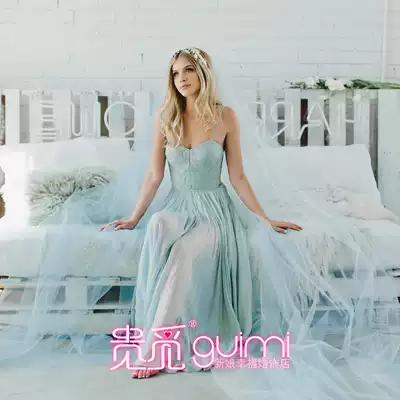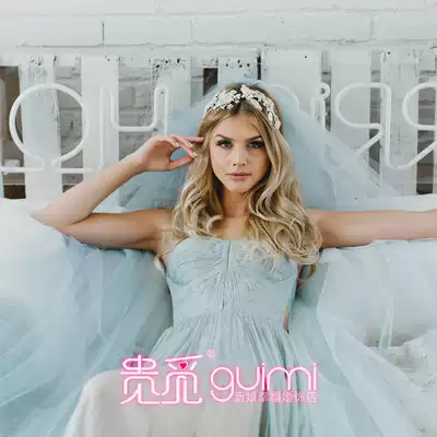 Bride veil light blue New Korean style super long tailing photo props Super fairy wedding veil marine color soft yarn