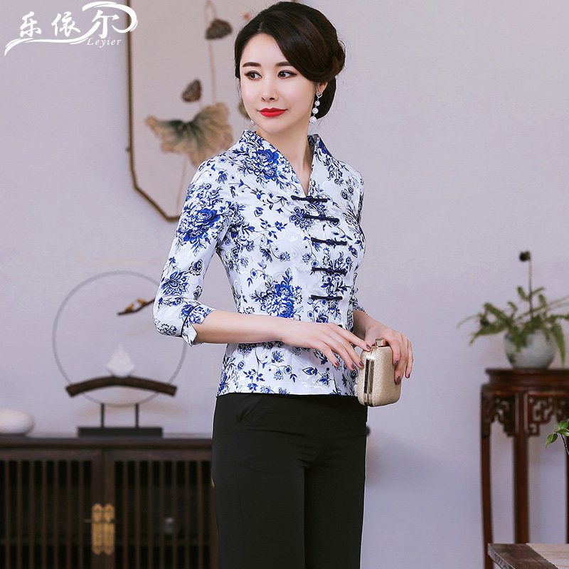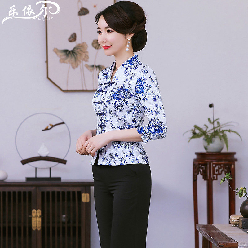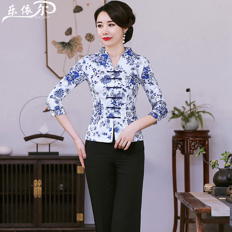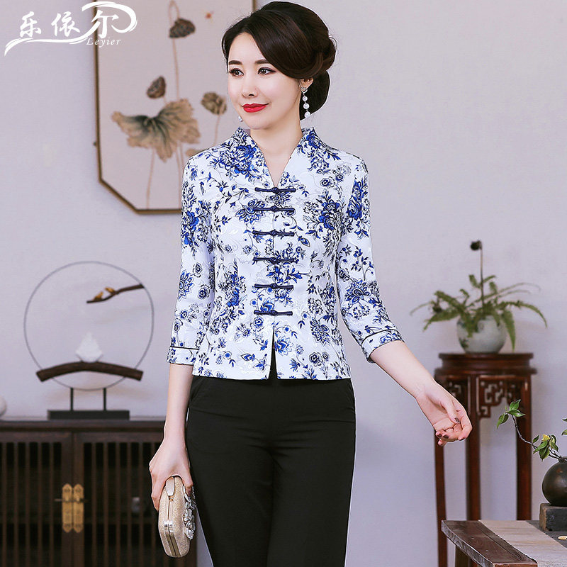 Qipao Improved blouses with short spring and autumn Qing flower Porcelain Tang Dress Qipao two sets Mom loaded with wide leg pants suit large size