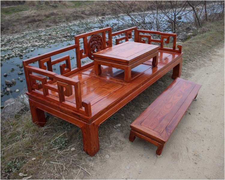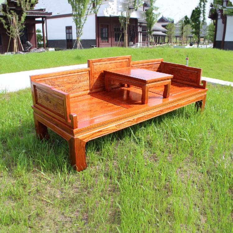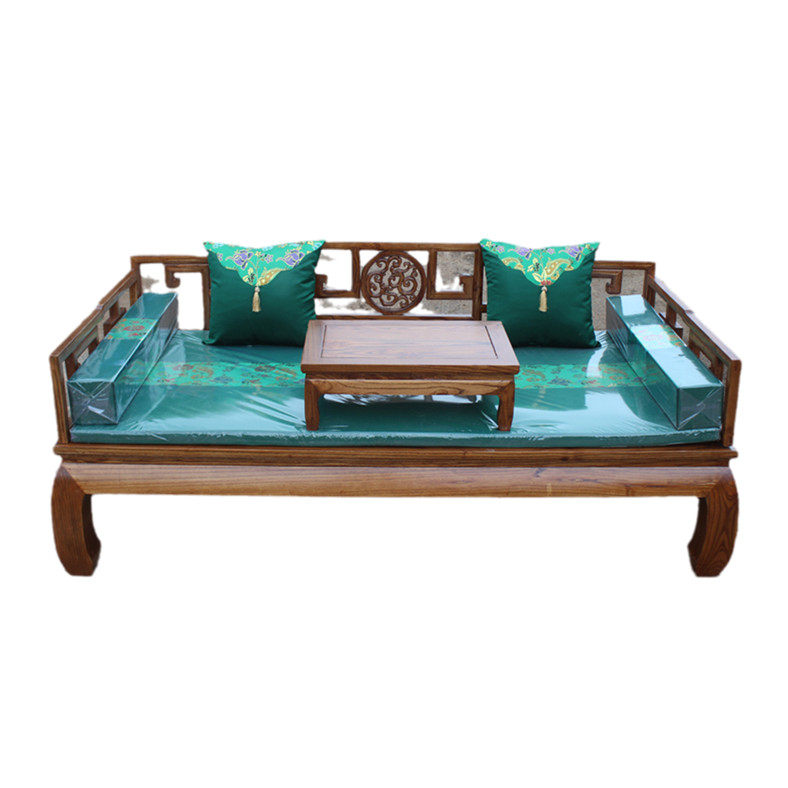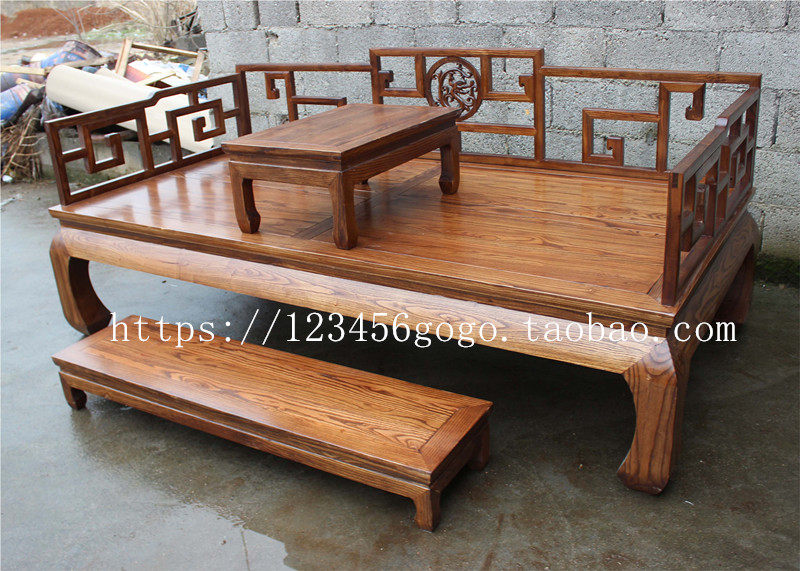 New Chinese style solid wood three-person sofa living room Arhat bed elm double seat chaise longue simple small apartment