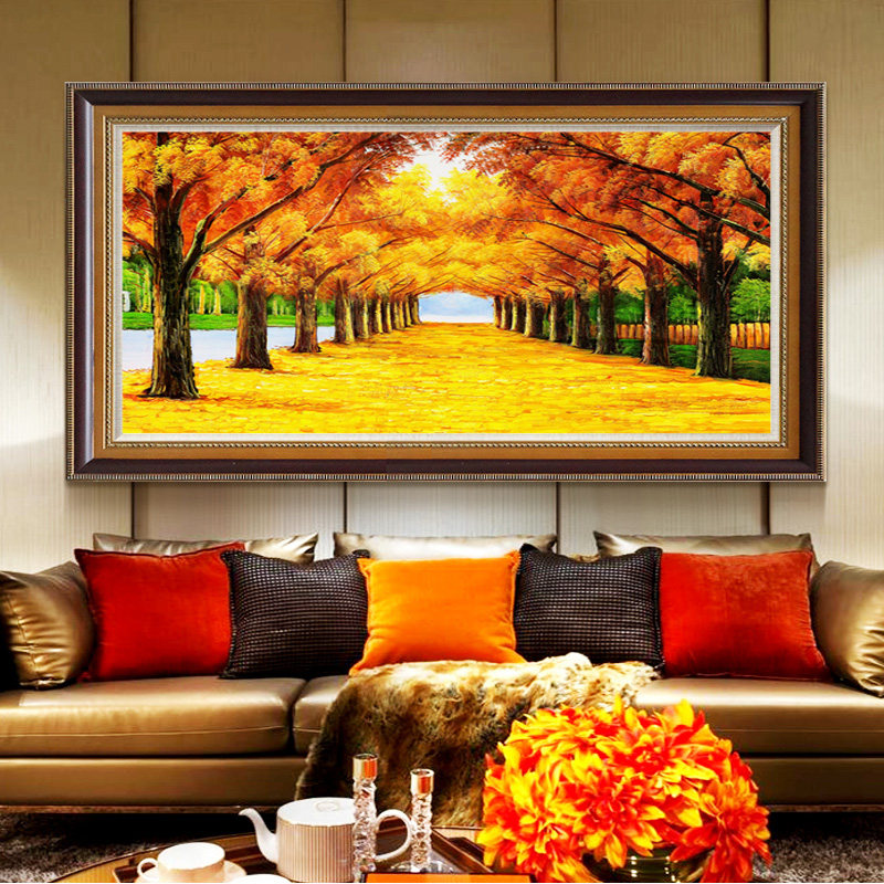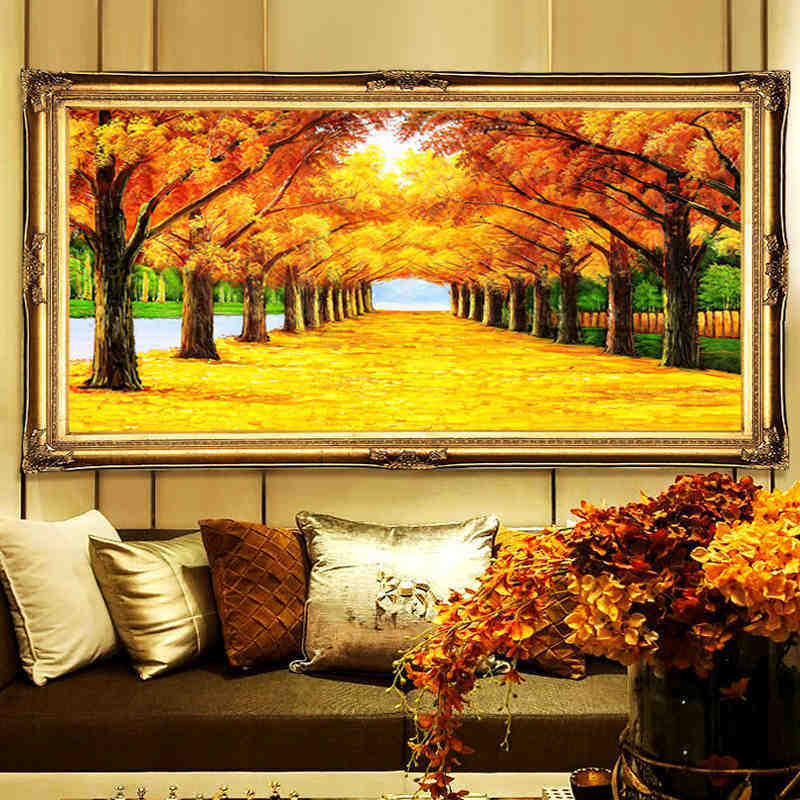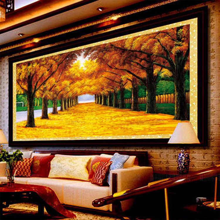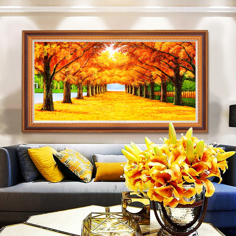 Mona Lisa printed cross embroidered gold full view picture of the new living room with great scenic view