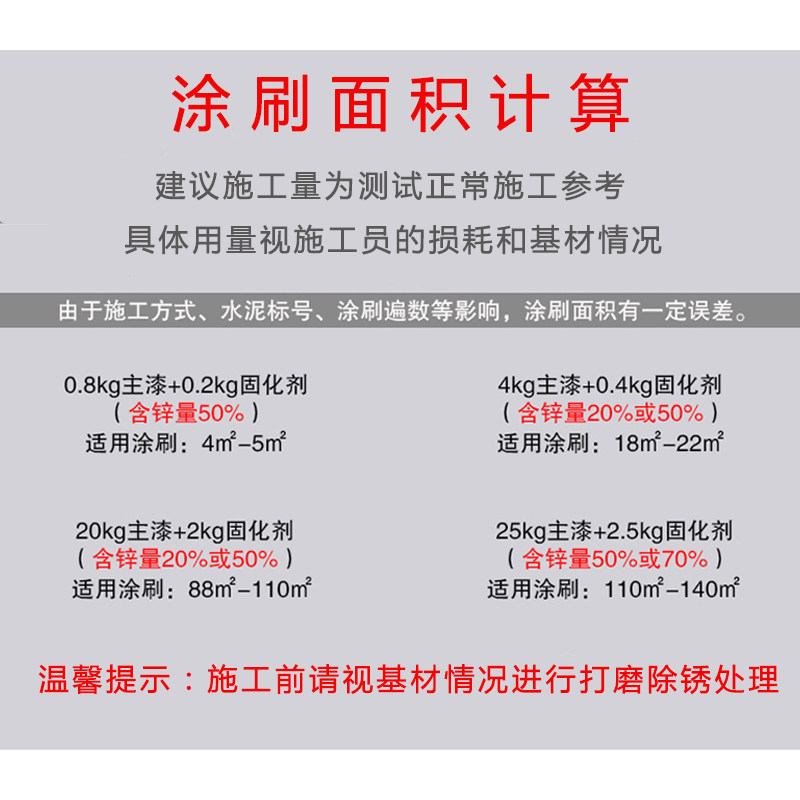 0.8kg main paint + 0.2kg curing agent (50%) 4kg main paint + 0.4kg curing agent (30%) 4kg main paint + 0.4kg curing agent (50%) 20kg main paint + 2kg curing agent (30%) 20kg main paint + 2kg curing agent (50%) 20kg main paint + 2kg curing agent (70%) 25kg main paint + 2.5kg curing agent (50%) 25kg main paint + 2.5kg curing agent (70%) 5kg stainless steel galvanizing special primer 5kg Metal Epoxy Solid Primer 20kg Metal Epoxy Firm Primer 5kg Epoxy Zinc Yellow Primer 20kg Epoxy Zinc Yellow Primer Diluent 500G Diluent 2KG Weight according to the above specifications
