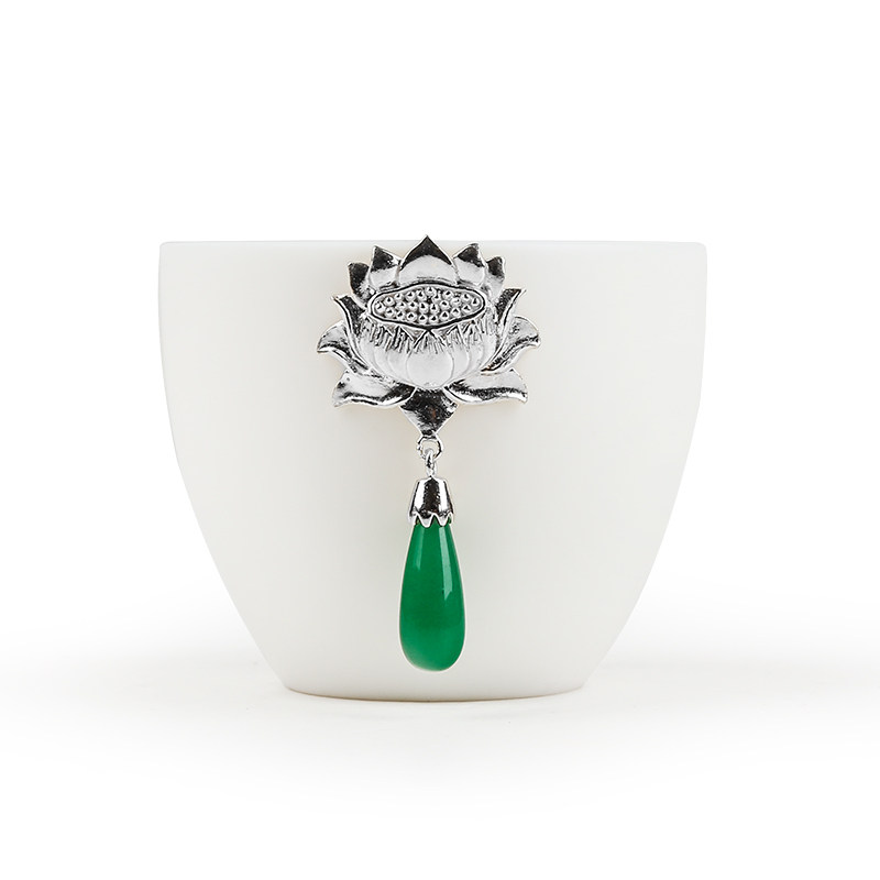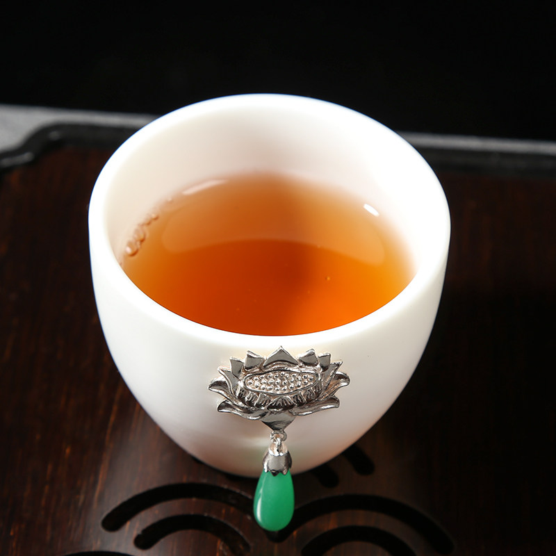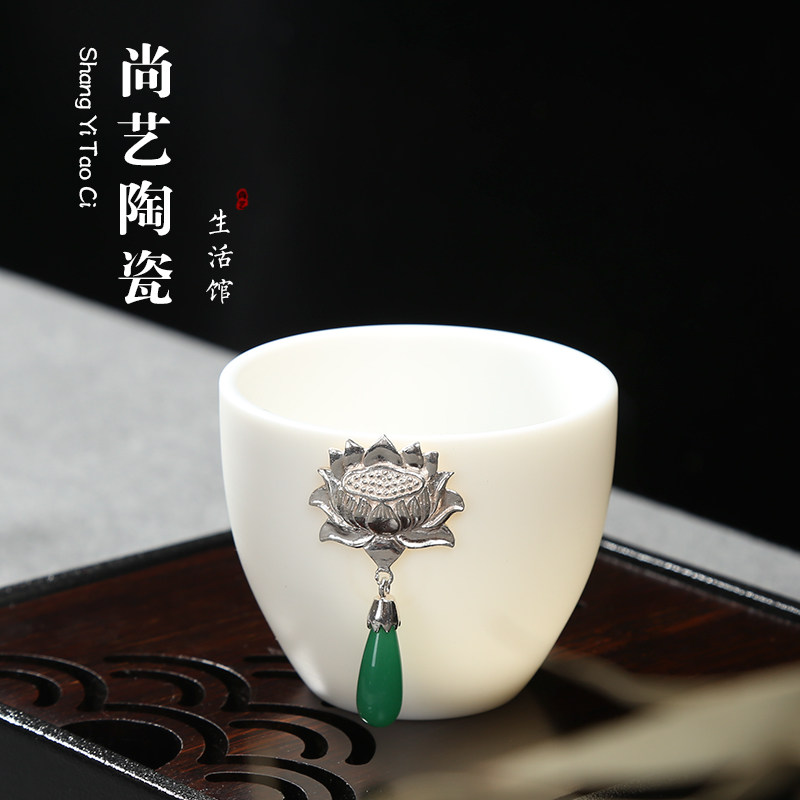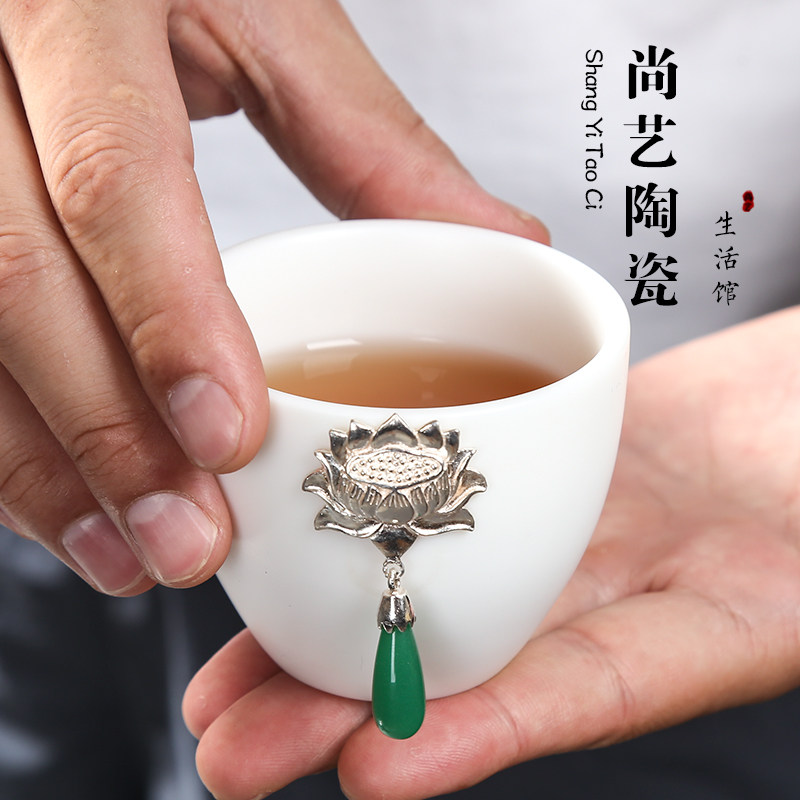 Defied white porcelain inlaid pure silver tea cup goat fat jade Dingkiln hung jade silver fish cup Pink cup Gongfu tea with single master's cup