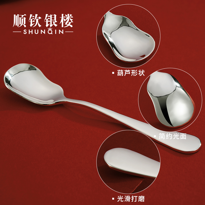 Shunqin Silver House 999 Foot Silver Spoon Sterling Silver Spice Spoon Adult Long Handle Gourd Shaped Silver Tableware Soup Spoon Coffee Spoon Ceremony