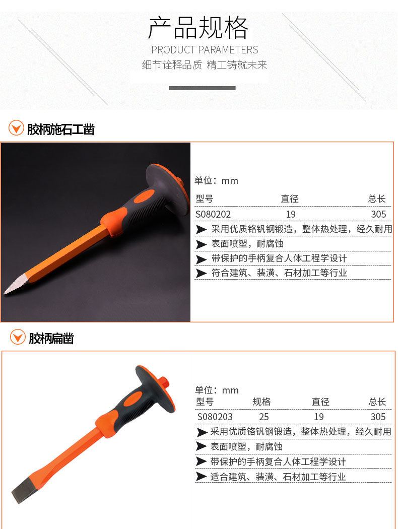 Full woodworking stonework steel shield S080202 rubber shank stone construction chisel chiseled chiseled chrome vanadium steel chisel