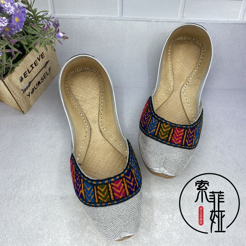 Pakistan handmade shoe embroidered line handmade cow leather India-Pakistan ethnic wind embroidered embroidered wire shoe silver color