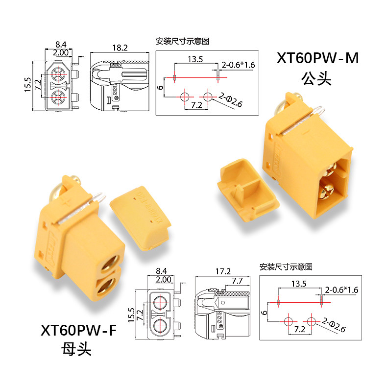 XT60PW plug horizontal circuit board with 90 degree foot connector All copper gold plated welding foot male and female model airplane accessories