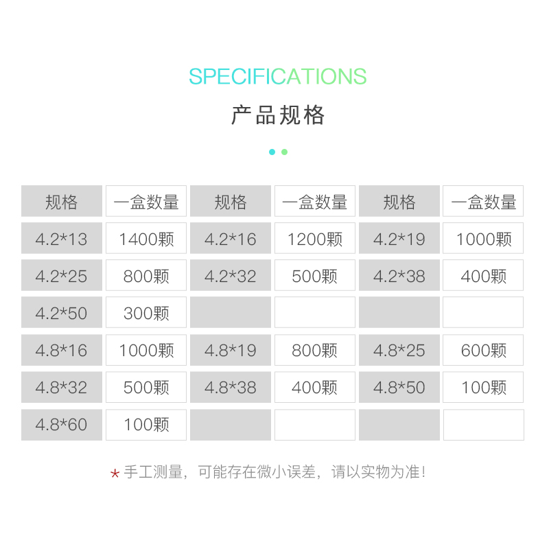 M4 2X13 (1400pcs)M4 2X16(1200pcs) M4 2X19(1000pcs) M4 2X25(800pcs) M4 2X