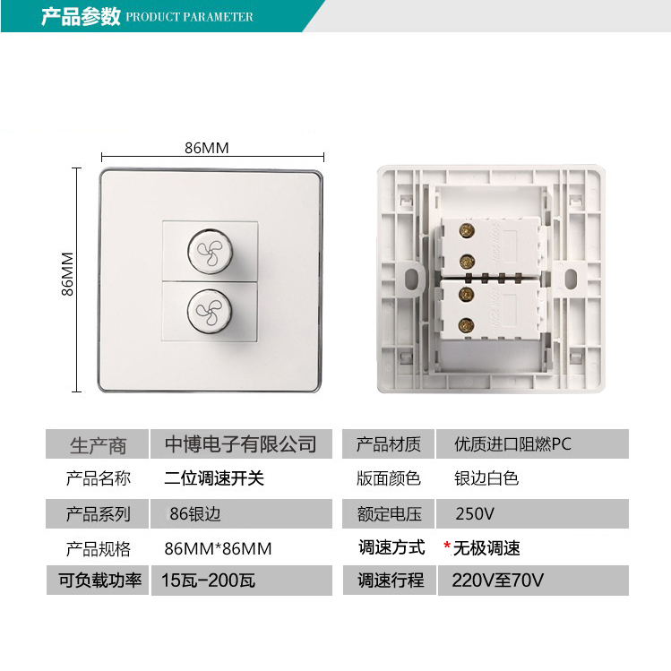 86 type stepless speed control switch two-position two-button ceiling fan fan motor adjustment switch 220V ceiling fan governor