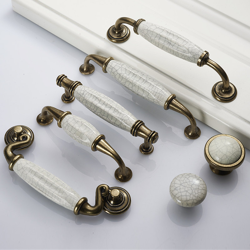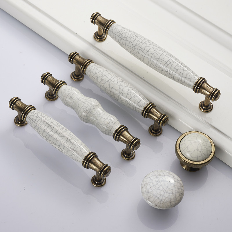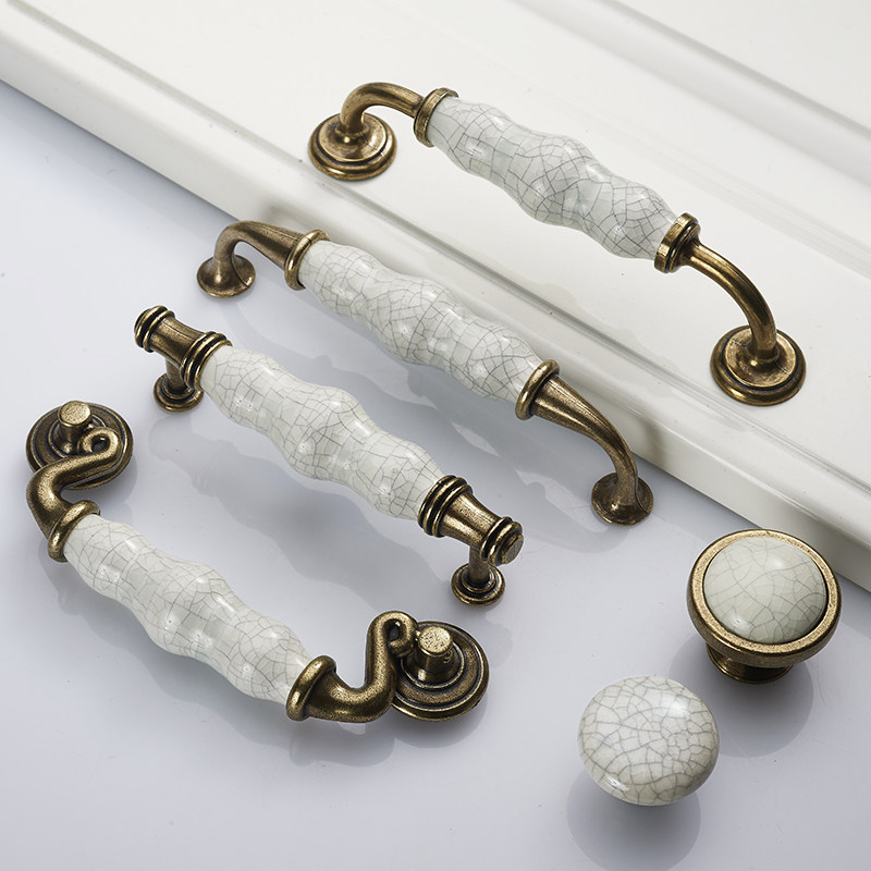 Cabinet drawer wardrobe door handle crack ceramic pastoral style green bronze handle European broken grain handle