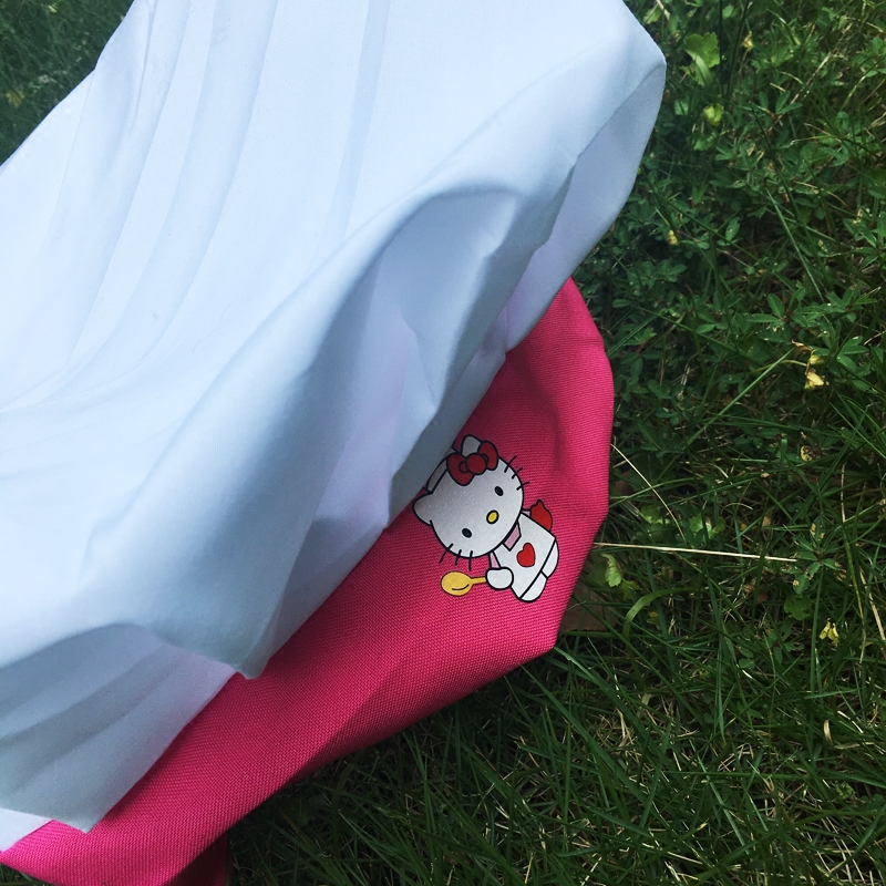Pink rim kitty hatPink rim kitty apronPink kitty sleevesBlue rim kitty hatBlue rim kitty apronBlue rim kitty sleevesPink rim kitt