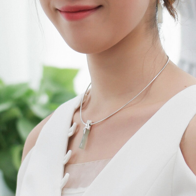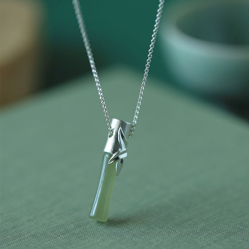 "Bamboo leaves Qingqing" Xi Sui pure silver and Tian jade necklace personality temperament 100 hitch pendant pendant female lock bone chain