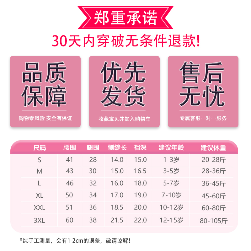 S size (recommended for 1-3 years old) 20-28 catties M size (recommended for 3-4 years old) 28-36 catties (L size recommended for 4-6 years old) 36-45 catties XL size (recommended for 6-8 years old) 4