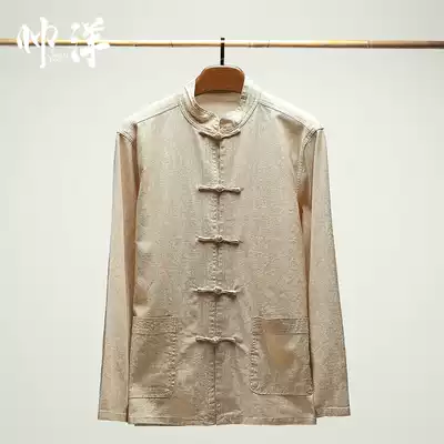 Tang suit men's spring and autumn linen long-sleeved shirt Chinese large size stand-up collar lay Hanfu shirt
