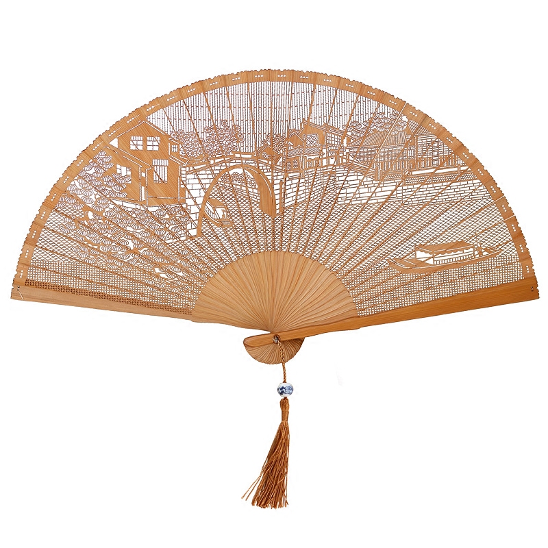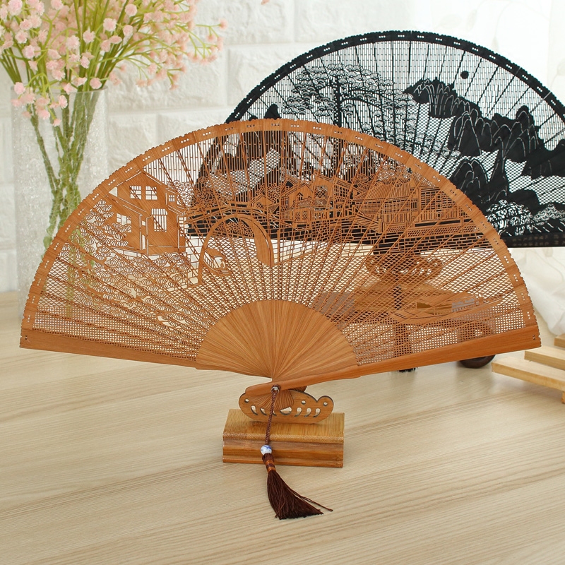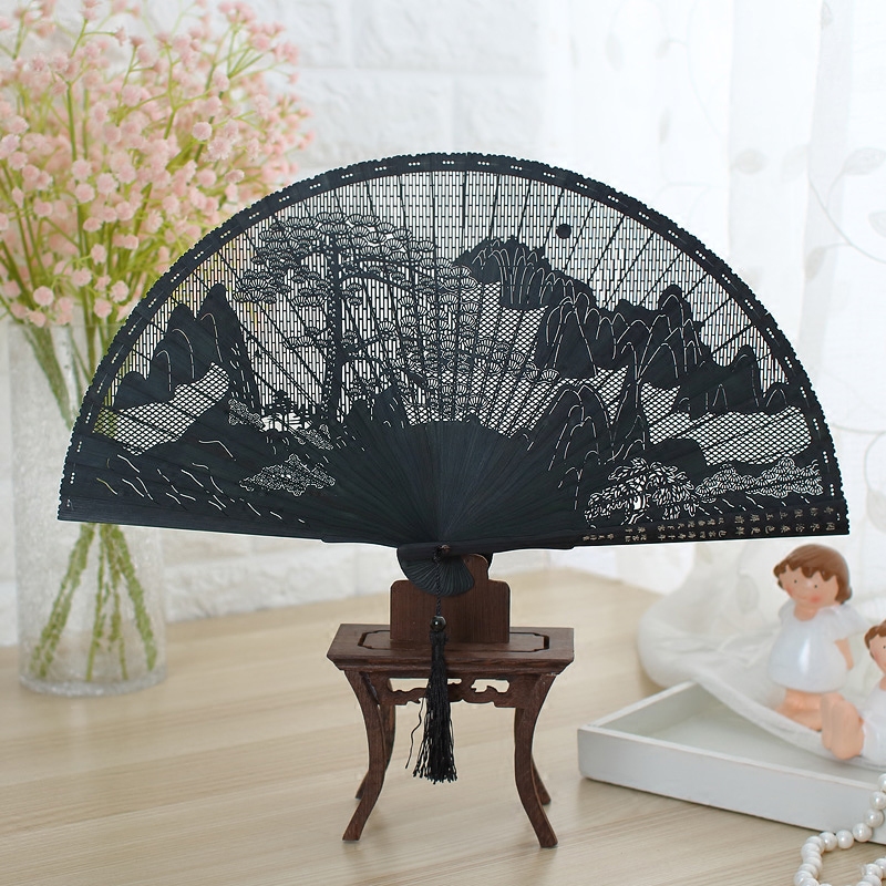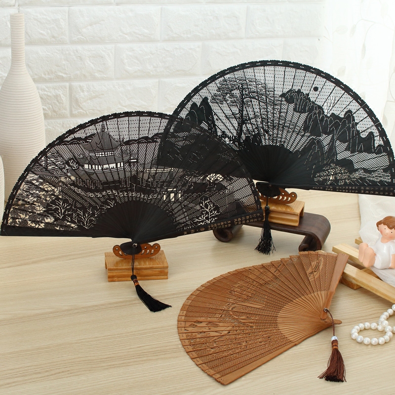 (Courtesy) Chinese wind folding fan Gift full bamboo scenery engraving folding and folding process fan ancient wind hollowed-out gift fan