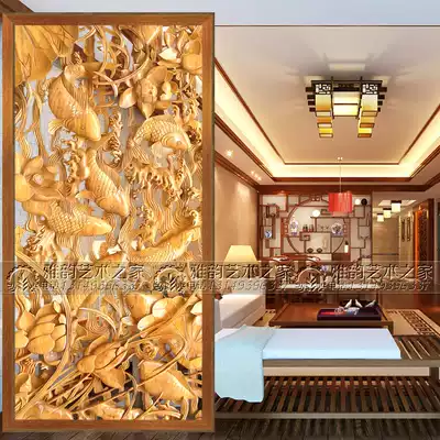 Art glass porch screen partition living room background wall aisle deep carved glass partition door Lotus wood carving fish
