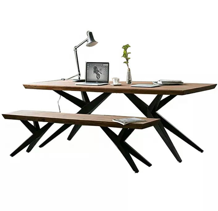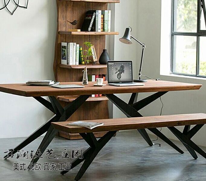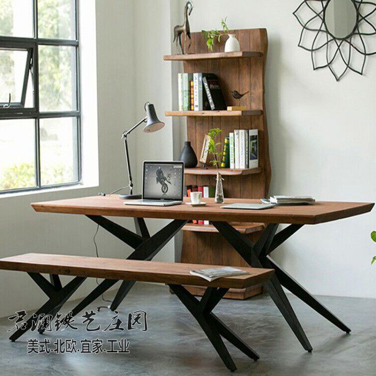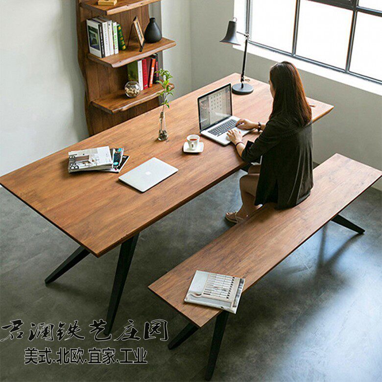 Nordic simple and beautiful fashion dining table and chairs American solid wood old dining room rectangular table bench wrought iron computer desk desk