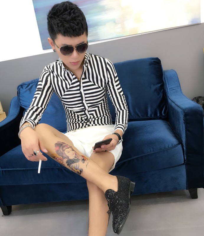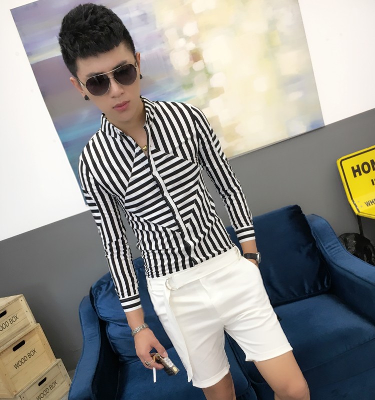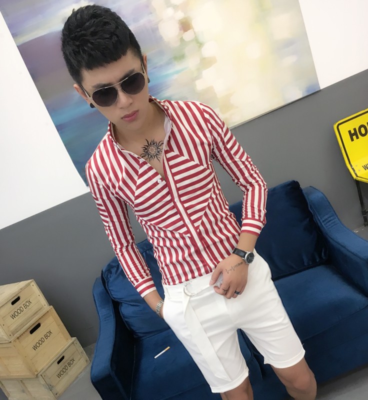 Tight Striped Shirt Men's Body Night Club Workwear Long Shirts Hairdressshop Fashion Thin bar Overalls trendy