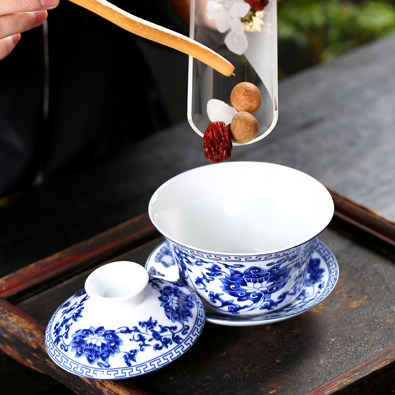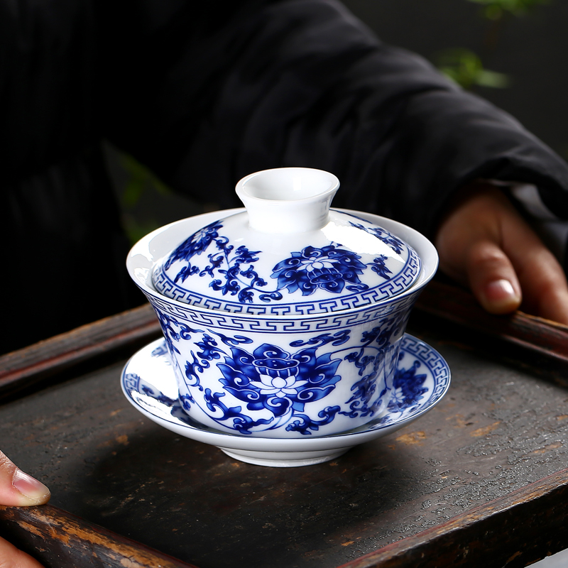 Cover bowl large blue porcelain three cups of tea cup cup cup three guns tea cup tea mountain water kung fu tea