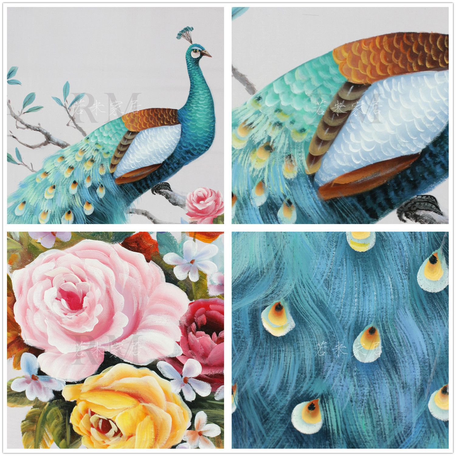 73x106 Beauty Style Hand-painted Fireplace Decoration Oil Painting Genguan Decoration Hung Painting Blue Green Blue Flower Peacock