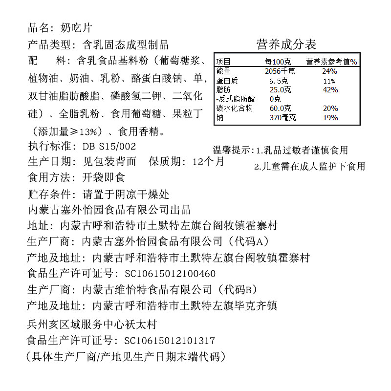 Saiwai Yiyuan milk eat slice fruit grain milk eat slice Inner Mongolia milk slice dry eat fruit grain milk slice 500 grams