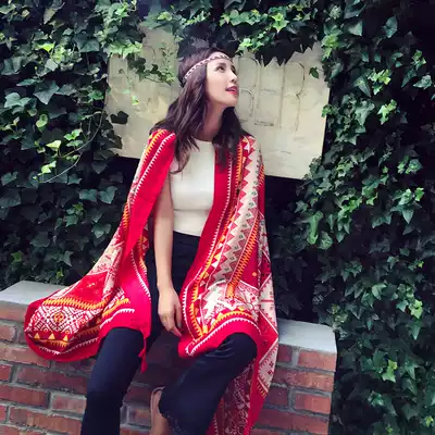 Small home red geometric printing ethnic style shawl cotton linen scarf women travel holiday sunscreen silk scarf beach towel