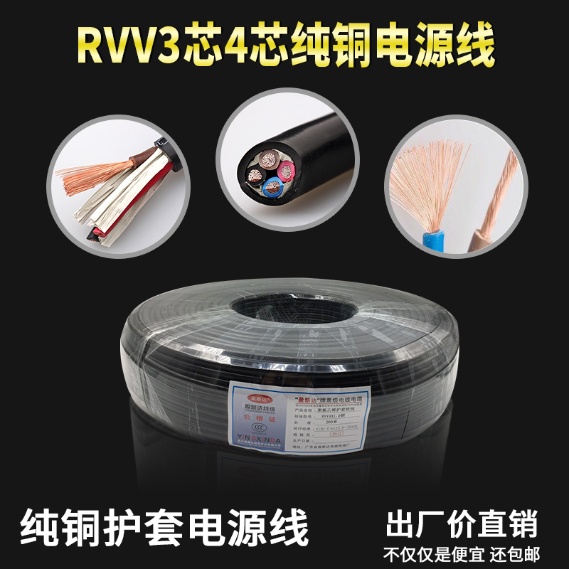 National standard pure copper wire and cable RVV3 core 4 core 0 5 0 75 1 2 5 4 square control waterproof sheath line