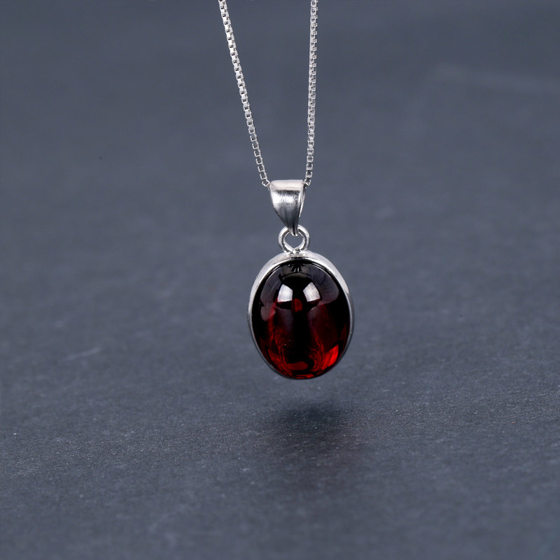 S925 Pure Silver Oval Geometric Necklace Red Pomegranate Stone Zircon Pendant Lock Bone Chain Brief Temperament Necklace Ornament