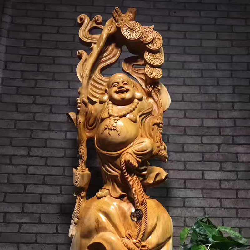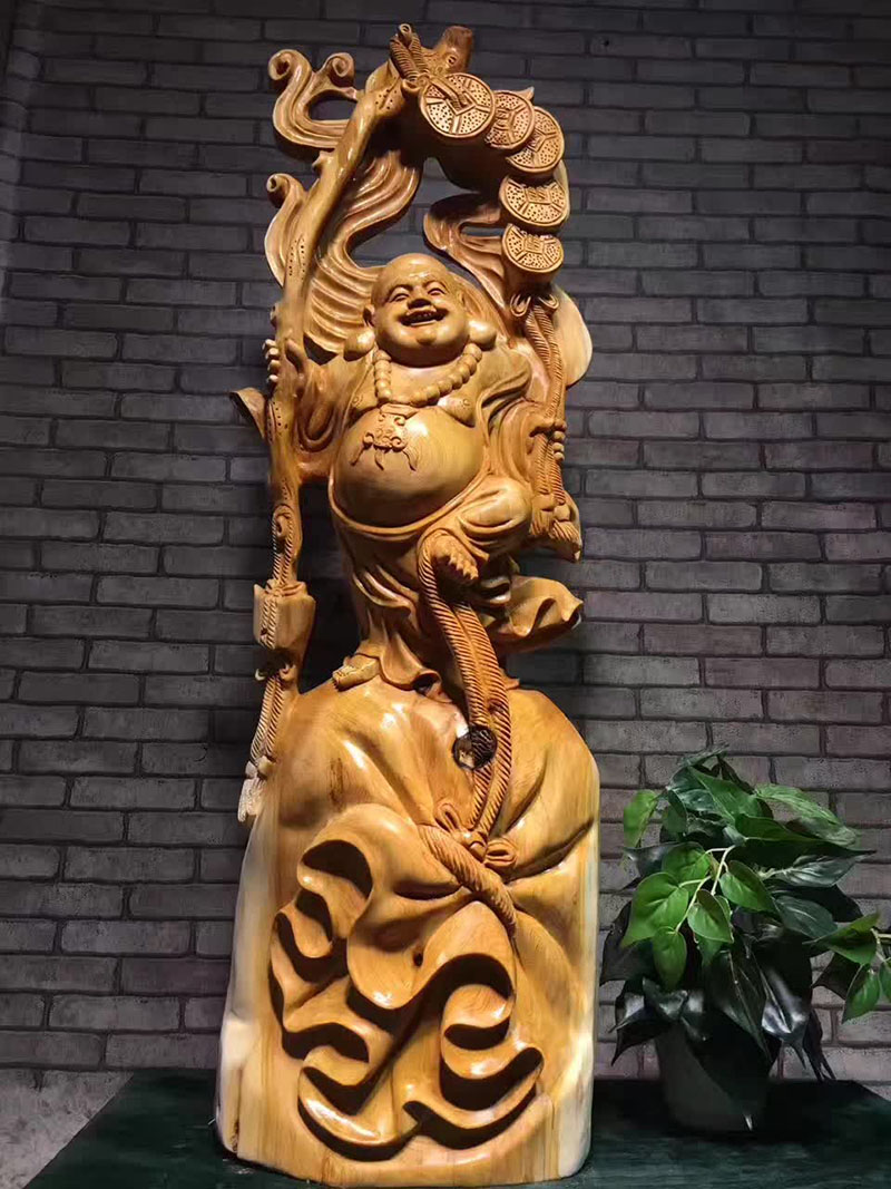 Wood root carving factory Cliff cypress carving Ruyi bag Maitreya Buddha statue overall carving Qinling cliff cypress ornaments direct sales