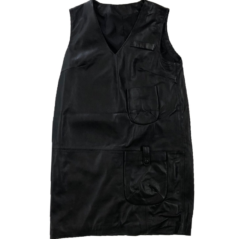 2021 autumn and winter new leather leather skirt women's wild V-neck A-line skirt medium and long sleeveless sheepskin suspender skirt